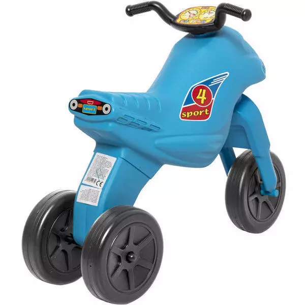 Motocikel brez pedalov svetlo modre barve, s preprosto, vendar čudovito zasnovo, izdelan iz plastičnega materiala. Sprednje kolo je vodljivo in je narejeno iz plastike. Motocikel je okrašen z nalepkami. Dimenzije: 55 x 27 x 42 cm. Motocikel spada v velikostno kategorijo 4. Višina sedeža: 25 cm.